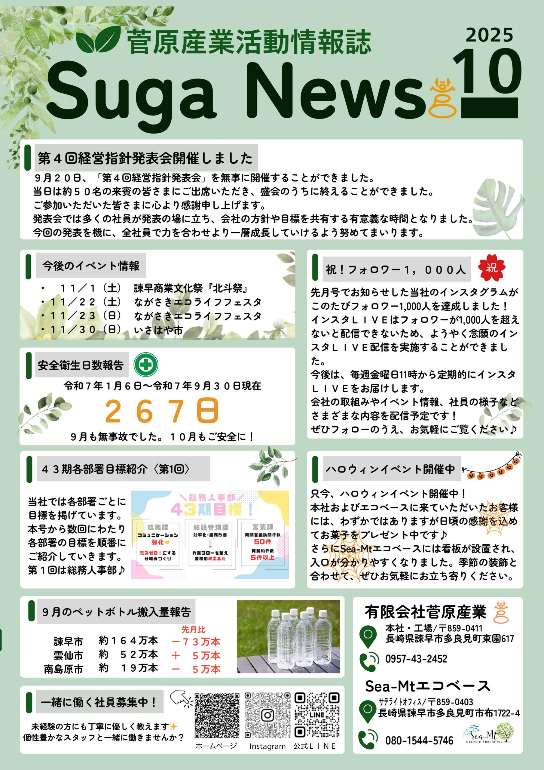 有限会社菅原産業 活動情報誌の10月分を発行しました! 2025年10月14日 最終更新日時 : 2025年10月14日 voice 皆さんこんにちは、(有)菅原産業の菅原です。 活動情報誌の10月分を発行しました! 10月はハロウィン企画として、ご来所の方全員にお菓子のプレゼントを実施中です! リユース会なども企画中! 日々進化を続けるSea-Mtエコベース(会社もね!)にお気軽に立ち寄りください。